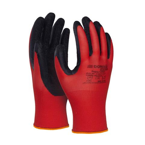 Jó minőségű, piros színű, kötött poliészter szövetből készült kesztyű, a markolat részén fekete színű, érdesített latex bevonattal.
