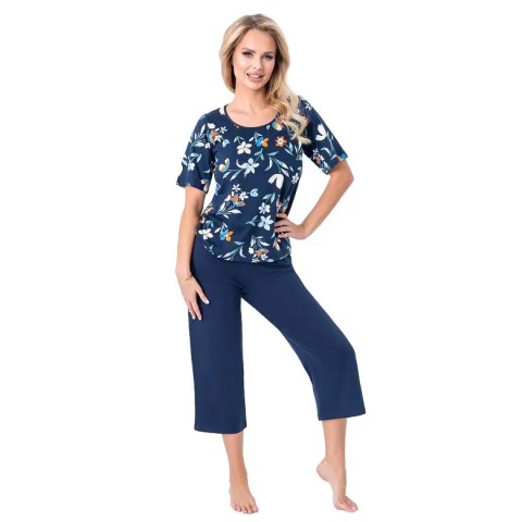 A Caroline pizsama kényelmes szabású, 3/4-es nadrághosszal rendelkezik, mutatós kék színű és színes virágmintás. A Caroline 3/4 pmautpizsama 100% pamutból készült, amely légáteresztő és kellemes tapintású. Kényelmes szabású, 3/4-es nadrágszárakkal és rövid ujjakkal rendelkezik. A pizsama kerek nyakkivágású és kék színű, virágmintás. Anyagának köszönhetően kényelmet viselet, kíméletes a bőrrel.