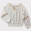 Gyűrt anyagű, hímzett blúz Szűkülő szabású, kerek nyakkivágású, alja gumis. Hibátlan állapotú.