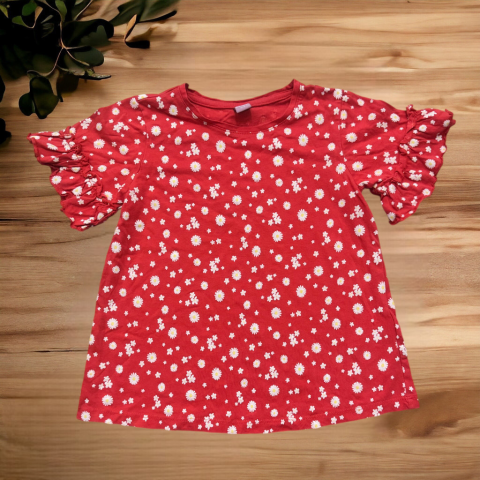 Margarétás felső Kissé bővlő szabású, kerek nyakkiváágús, ujja fodros. Kellemes pamut anyag. Szép állapotú.