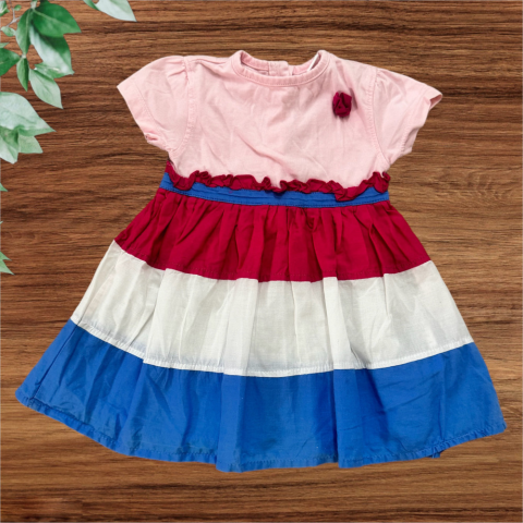 Színes csíkos kisruha Bővülő szabású, kerek nyakkivágású, hátán 4 gombbal záródik, elején virággal. Kellemes és vékony pamut anyag. Hibátlan állapotú.