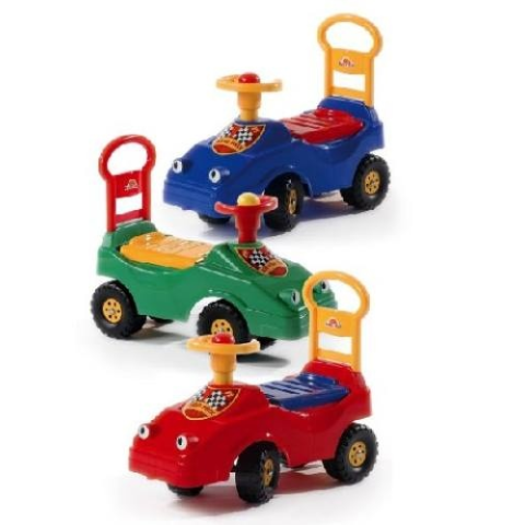 Műanyag kerekű, ráülős, lábbal hajtható játék autó. Kormányozható, nyitható üléssel és dudával. Színe: zöld. Mérete: 57×24×45 cm. Ajánlott korosztály: 1-3 év. Magyar termék!
