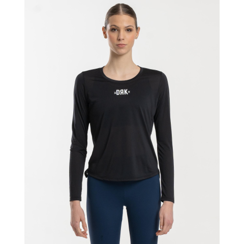 Dorko Training Női Póló Dorah Long Sleeve Top W DT25S136W__0001. Színe: fekete A Dorko Dorah hosszú ujjú felső könnyű, légáteresztő anyagával olyan érzést nyújt, mintha semmi sem lenne rajtad csak te, a mozgás és a flow. A regular fit szabás kényelmesen követi a tested, miközben elég laza ahhoz, hogy szabadon mozoghass benne. A hátul enyhén hosszított fazon extra takarást ad. Az elülső print logo és a nyakrész belső "trai