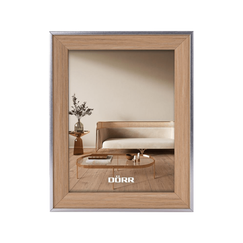 A DÖRR "Villa" keretsorozat modern, fa hatású műanyag keretekből áll. Az enyhén megemelt, ezüstös élek világos, finom kontrasztot alkotnak a meleg fatónusokkal. Maga a keretszalag sima és matt felületű.