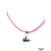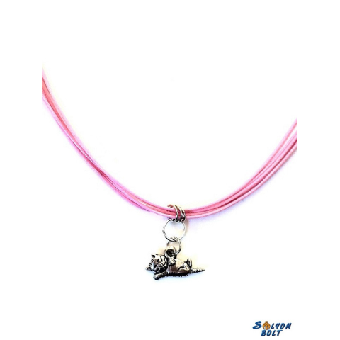 Fekvő cica medállal, 5 db rózsaszín viaszolt zsinórból nyakpánt, delfin kapoccsal. A nyakpánt hossza: kb 38 cm Medál mérete: 2 x 1 cm