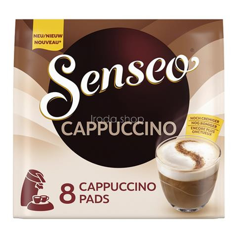 Kávépárna, 8 db, 92 g, DOUWE EGBERTS Senseo, Cappuccino Krémes és aromás kávé, ellenállhatatlanul lágy habbal a tetején. Egy csomag 8 db kávépárnát tartalmaz. Dupla vastagságú kávépárna, ezért a két adagos szűrővel kell használni.