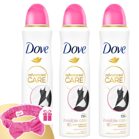 1 kép DOVE Advanced Care női Dezodor Invisible Care 3x150ml + Ajándék Hajpánt