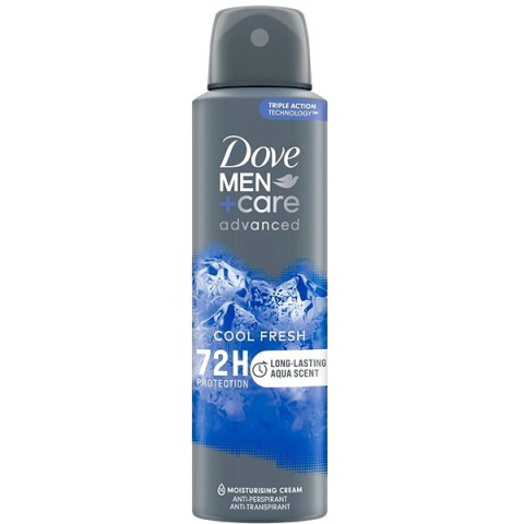 Dezodor - férfi, spray kivitel, zsíros, normál, kombinált, száraz és érett bőrre ajánlott, frissítő illattal, hidratáló, védő és tápláló, hosszan tartó hatású, mindennapi használatra, szagok ellen, alkoholmentes, 150 ml-es kiszerelésben Szerezz magabiztosságot egész napra ezzel a Dove Men+Care Cool Fresh férfi izzadásgátló spray-vel. Akár 72 órás védelem az izzadás és a kellemetlen szag ellen, valamint táplálja a hónaljbőrödet. A Tri