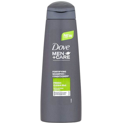 Sampon férfiak számára - minden hajtípusra ajánlott, hajsimító hatás, 2in1 (sampon + balzsam), koffeines, 400 ml-es kiszerelésben A Dove Men+Care Fresh & Clean férfi sampon és kondicionáló egyben. Ez a speciálisan összeállított kombináció a tökéletes zsíroldásért, mentollal a hosszan tartó friss érzésért. A koffein emellett