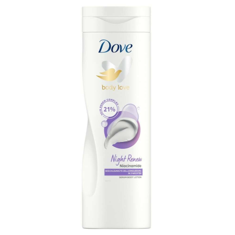Dove Night Renew testápoló 400 ml. A Dove Night Renew testápoló tartós, 72 órán át tartó hidratáló ápolást biztosít a száraz, fáradt bőrnek. A niacinamidot tartalmazó formula segít felgyorsítani a bőr megújulását, felélénkíti, rugalmassá teszi a bőrt....