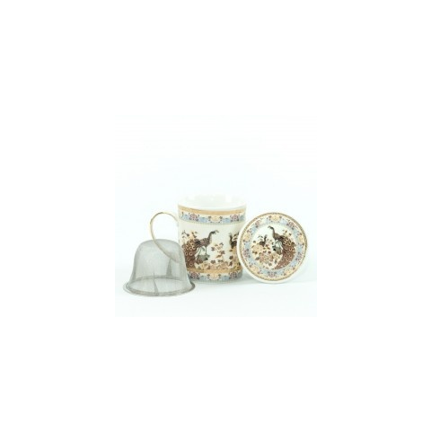 Minőségi porcelán teáscsésze kúpos, porcelán tetővel, plusz egy fém teaszűrővel a teázás kényelmének érdekében. A csészét eredeti kínai motívumokkal díszítik. Négy féle (kék páva, arany fácán, zöld páva, lepke) motívummal rendelhető. Szálas gyógyteákho