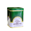 Kiváló minőségű, jázminvirággal aromásított zöldtea, szálas kiszerelésben, fém dobozban.