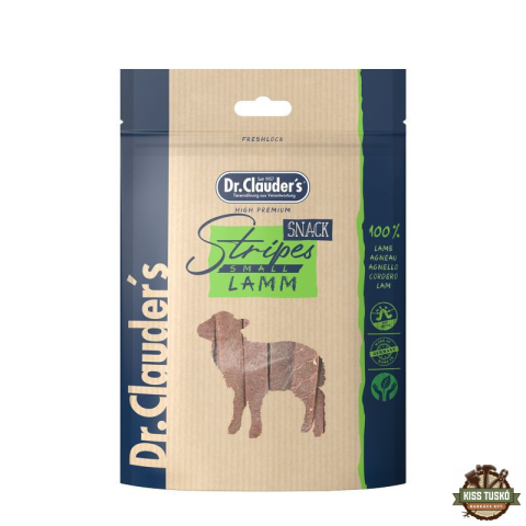 Dr.Clauders Dog Jutalomfalat Stripes Small Bárányhús csíkok 80g Kiegészítő eledel kutyáknak. A Dr.Clauder's Stripes Snacks Lamb 95%-ban ízletes bárányhúsból készült jutalomfalat kutyáknak. A hús a kíméletes gőzszárításnak köszönhetően megőrzi egyedi íz