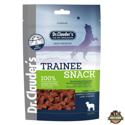 Dr.Clauders Dog Jutalomfalat Trainee Snack Bárányhús 80g 100% hústartalmú puha kockák, rendkívül ízletes és tápláló, tréningre, kutyaiskolába is alkalmas. Zsebbarát, nem zsíroz, kedvenced pedig egy pillanat alatt elfogyasztja, nem rágódik rajta. Tartós