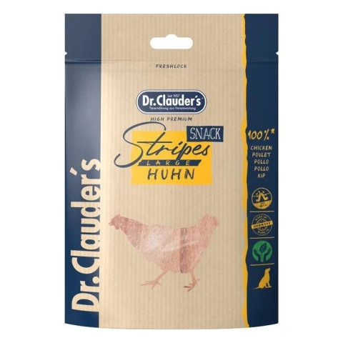 Kiegészítő eledel nagytestű kutyák részére. A Dr.Clauder's Stripes Chicken Snacks Large 95%-ban ízletes csirkehúsból készül, és ideális a napi jutalmazáshoz és tréninghez. Az alacsony kalóriatartalmú csirkehús magas vitamin- és fehérjetartalommal rende