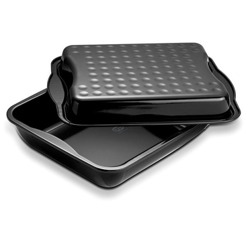 Sütőedény - anyaga: zománcozott acél, karcálló, mosogatógépben mosható és fedél, 340 mm széles, 420 mm hosszú, 80 mm magas, A robusztus, különleges anti-drop fedővel ellátott tepsi nem csak lasagnához és főtt ételekhez kiváló, de húst is süthetsz benne, sőt kocsonyát is készíthetsz a segítségével. A gőz a tepsi fedelén egy