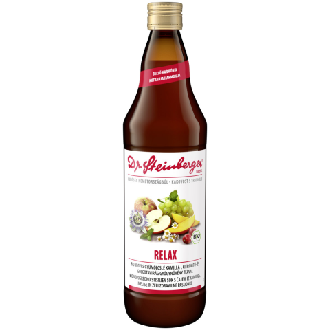 Dr.steinberger bio relax 750 ml Nyugtató gyógynövények ízletes gyümölcslével kombinálva. Gondosan válogatott alapanyagokból készült bio gyümölcslé, kamilla, citromfű és golgotavirág gyógytea hozzáadásával. Az alma-, szőlő-, mangó- és acerola-lé gyümölc