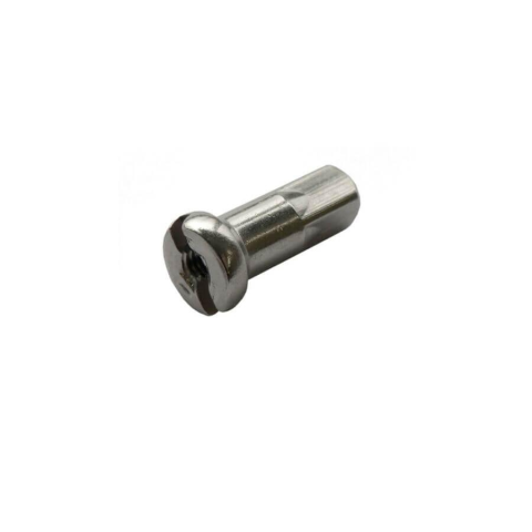 Nikkelezett réz küllőanya 2,34 mm átmérőjű küllőkhöz, 12 mm hosszú.