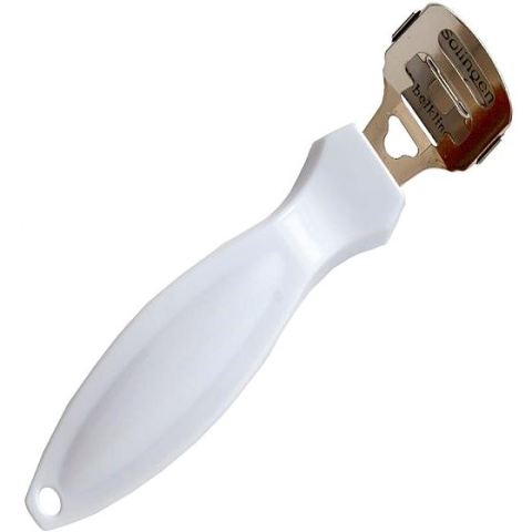 Talpgyalu - elszírusodott bőrhöz, kétoldalú, otthoni és professzionális használatra, a borotvapengék cserélhetők, műanyag fogantyú, hossza 16 cm Ez a lábon lévő megkeményedett bőr kezelésére szolgáló eszköz otthoni és professzionális használatra készült. A DUKAS sarokvágó megfordítható, lehetővé teszi a pengék cseréjét, és műanyag fogantyúval