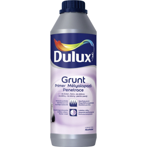 A Dulux Grunt impregnáló mélyalapozó. Beszívódik a felületbe, stabilizálja, megerősíti és egyenletessé teszi a falat, megkönnyíti a festék tapadását. A felhasználásra kész, hígítást nem igénylő Dulux Grunt felvitelét megkönnyíti halványlila színe, amely mutatja a már kezelt felületet.