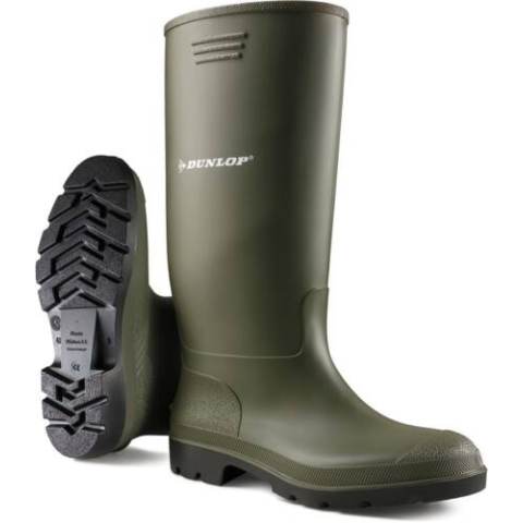 DUNLOP® PRICEMASTOR ZÖLD D95035-47 • zöld színű tiszta PVC munkacsizma általános ipari és mezőgazdasági felhasználásra • ellenáll savaknak (pl. 20% kénsav, 20% sósav, 50% foszforsav), lúgoknak (20% nátriumhidroxid), fertőtlenítőszereknek • alaktar