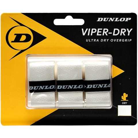 Grip ütőhöz - felső, 0,59 mm vastagság, perforált, anyaga poliuretán, 3 db a csomagban, fehér kivitel The DUNLOP Viper-Dry tennis grip guarantees you a secure grip on the racket. It excels with its high adhesion and ability to perfectly absorb moisture and sweat through perforations on the sur