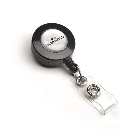 Azonosítókártya-tartó, kihúzható, patentos, DURABLE, fekete Kör alakú kihúzható kártyatartó, hogy a biztonsági kártya mindig kéznél legyen. -fém csattal rögzíthető ruházathoz, táskához -a kártyatartó patenttal rögzíthető rá -fekete színű -műanyag