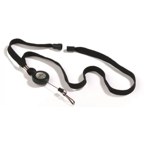 DURABLE Azonosítókártya tartó, kihúzható, patentos, fekete nyakba akasztóval,