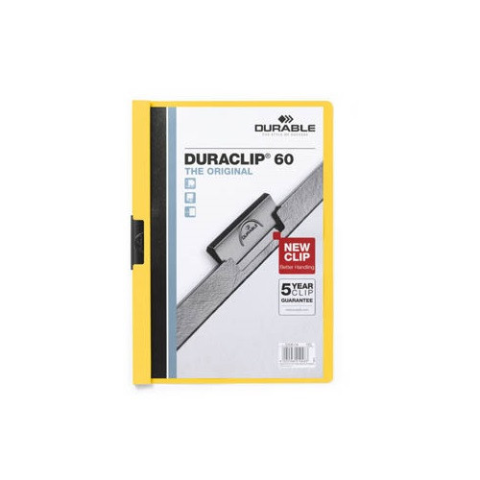 Klipmappa DURABLE Duraclip A/4 60 lapig sárga Műanyag anyagú, víztiszta előlappal, színes hátlappal, oldalán speciális elasztikus acél klippel ellátott mappa, amelyek lehetővé teszik az iratok lyukasztás nélküli lefűzését és elegáns prezentálását. A ma