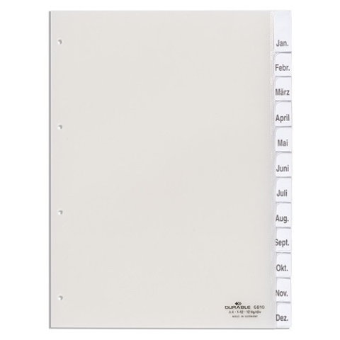 Elválasztólap PP Durable A/4 1-12-ig áttetsző PP alapanyagú elválasztólapméret: A/4szín:áttetsző 1-12 részes index szett, extra nyomtatott betétlapokkal, Január-December