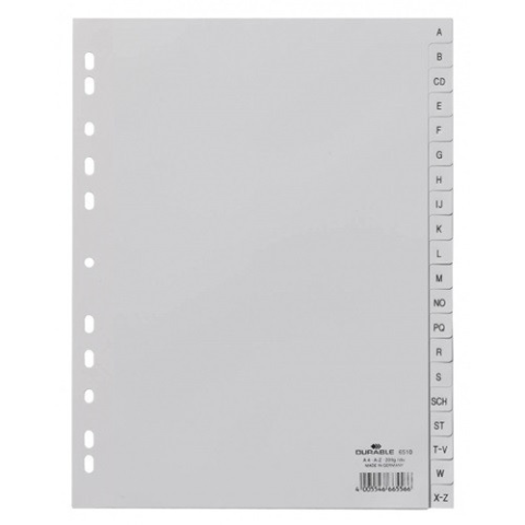 Elválasztólap PP Durable A/4 A-Z-ig szürke Szürke színű műanyag betűregiszter21 részes, A-tól Z-igMéret: 297 x 215mmUniverzálsi lyukasztás , minden iratrendezőbe használható