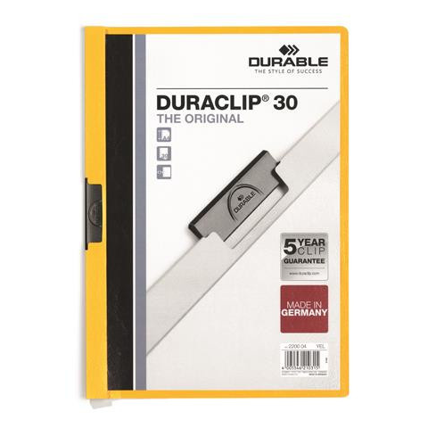 Gyorsfűző, klipes, A4, DURABLE DURACLIP® 30, sárga Az eredeti DURACLIP® tartós műanyagból készült klipmappa, ideális prezentációk, iratok, ajánlatok, konferenciák, szemináriumok jegyzeteinek vagy riportoknak lyukasztás nélküli lefűzérésre. -hátlap: