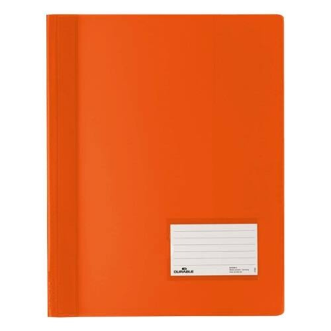 Gyorsfűző PVC Durable Duralux A/4 extra erős narancssárga Elegáns, áttetsző PVC mappa, műanyag bevonatú lefűző szerkezettel, belső zsebbel.Címketartóval névjegykártyák számára (57 x 90 mm) a borítólapon. Extra széles.Helykialakítással függőmappa sín sz