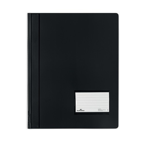 Gyorsfűző PVC Durable Duralux A/4 fekete Méret: A/4 Szín: fekete fém gyorsfűző szerkezettel ellátott, erős műanyag borítóval védi a dokumentumokat áttetsző fedlappal, mely plusz zsebbel ellátott (110 x 310 mm)