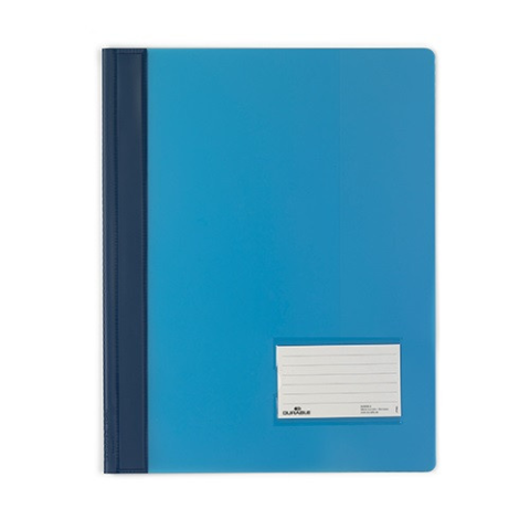 Gyorsfűző PVC Durable Duralux A/4 világoskék Méret: A/4 Szín: világoskék fém gyorsfűző szerkezettel ellátott PVC gyorsfűző speciálisan kialakított, vágott hátlap, mely megkönnyíti a lapok kivételét a gyorsfűzőből címketartóval névjegykártyák számára (