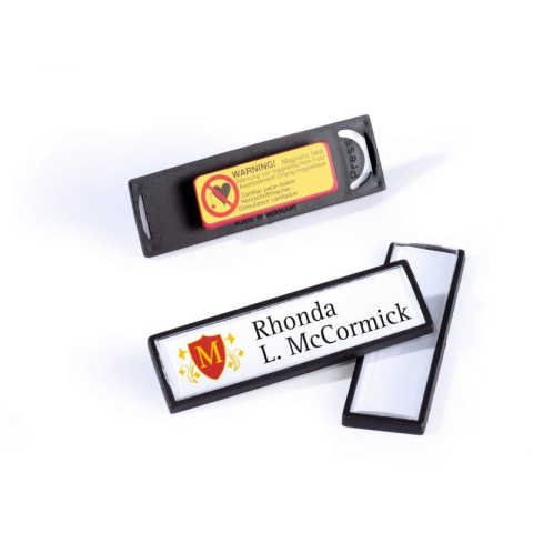Durable névkitűző mágneses csipesszel, elegáns, fekete kerettel és karcmentes fedlappal. Praktikus klipszerkezettel a betétlapok gyors és egyszerű cseréjéhez. Mágnessel az egyszerű és anyagot kímélő rögzítéshez érzékeny textilekre. A lekerekített sarkok é