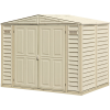 A Duramax bézs műanyag szerszámosház kompakt kialakítású, alapterülete 2,9 m2. A modern szerszámosház univerzálisan használható, alkalmas szerszámosháznak, kerti pavilonnak vagy hétvégi háznak. Átjárási szélessége 154 cm, átjárási magassága 157 cm. A széles bejáratnak köszönhetően a fa kerti házba való belépés kényelmes, akár nagyobb készülékekkel, kerti eszközökkel, kerékpárokkal vagy kerti bútorokkal is. Kerti műanyagház robusztus és tartós sze