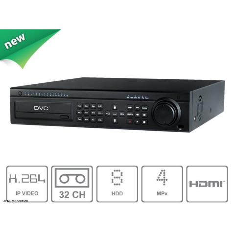 Standalone 32-channel NVR, resolution 3M/1080p/720p/25fps per channel, H.264 compression, 12Mbps/per channel throughput, SATA interface, 8 x HDD, audio, alarm input/output, power supply 230VAC.
