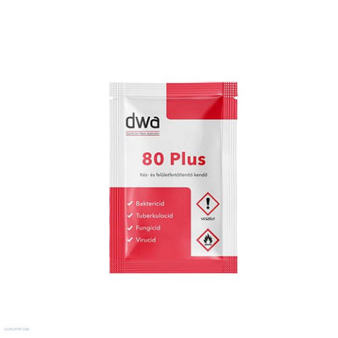 A DWA 80 plus fertőtlenítő törlőkendő higiénés kézfertőtlenítésre valamint, alkoholálló felületek fertőtlenítésére alkalmazható: Baktericid, Fungicid, Virucid, Tuberkolocid hatású. Alkalmazási koncentrációk, behatási idő: Baktericid hatás: 0,5 perc, Fungi