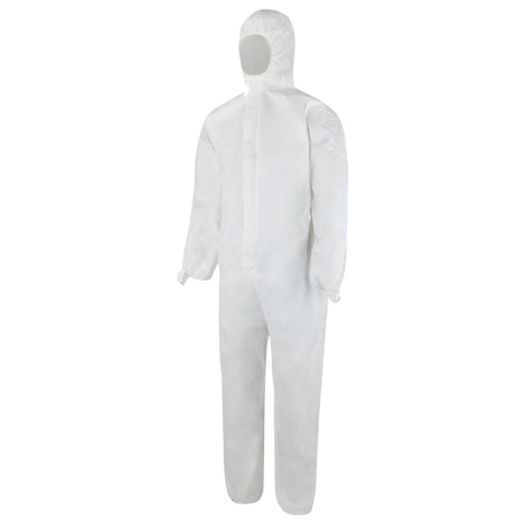 Winral egyszerhasználatos overál légmentes, antisztatikus, kapucnis védőruha nemszőtt anyagból, polipropilénből + mikropórusos réteg bővített lábközi rész összehúzó gumik a kapucnin, hátrészen, ujjak és nadrágszárak végén dekorsávval eltakart cipzár fehér