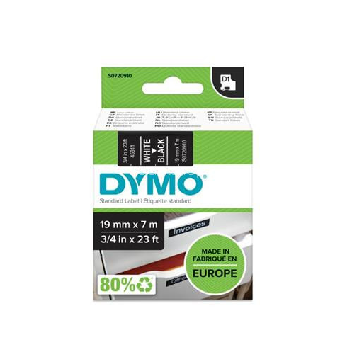 Feliratozógép szalag, 19 mm x 7m DYMO D1, fekete-fehér Az eredeti DYMO D1 címkék tökéletesek minden otthoni és irodai címkézési feladathoz. -D1 szabványos címke: eltávolítható, többféle felületre tapad, a hátoldala könnyen lefejthető -a kazetták külső