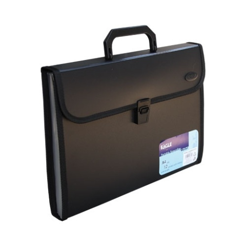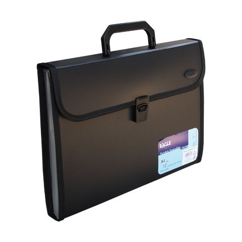 Műanyag, egyszínű irattartó mappa 12 tárolórekesszel, elején műanyag csattal, füllel ellátott. Kézitáska jellegű forma kialakítással.