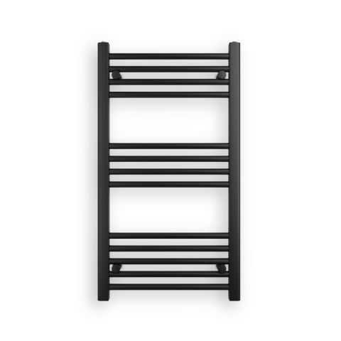 Ecoradco törölközőszárító radiátor 50 x 90 cm-es méretben, fekete színben. Egyenes kivitel 3 szekcióra bontott csövekkel (4+4+5 arányban). A radiátor tartozéka a 3 db rögzítő konzol és a menetes dugók. Működtethető elektromos fűtőbetéttel is. Paraméterek: