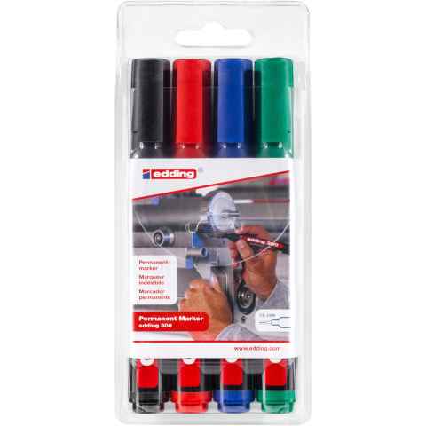 Az edding 300 Permanent marker szinte minden anyag, pl. papír, karton, fém, műanyag és üveg feliratozására, jelölésére. A kerekített csúcs vonalvastagsága 1,5 mm - 3 mm. Víz-és kopásálló szinte minden felületen. A termék utántölthető az edding MTK 25 utántöltő rendszerrel. Enyhe szagú tinta hozzáadott toluol / xilol nélkül. Permanent marker szinte minden anyag, pl. papír, karton, fém, műanyag és üveg feliratozására, jelölésére. A kerekített csúcs vonalva