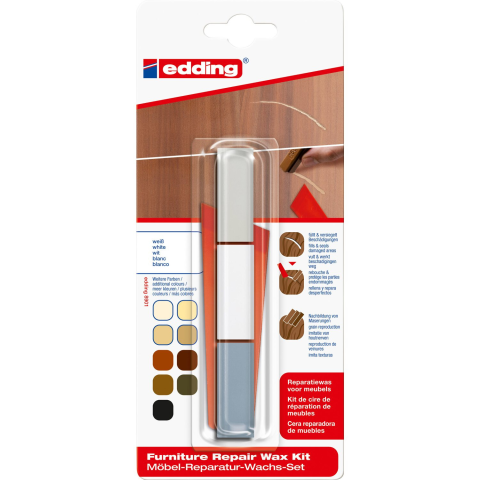 Bútorjavító viaszkészlet bútorokon vagy más függőleges vagy vízszintes fafelületeken keletkezett repedések és lyukak kitöltésére és javítására. A különféle viaszárnyalatok keverésével a fa textúrája tökéletesen utánozható. A puha viaszok ásványi viaszok keverékéből állnak, és földből, illetve oxidációból származó pigmentekkel vannak színezve. Elérhető 10 különböző kiszerelésben, csomagonként 3 különböző színnel és egy műanyag spatuláv