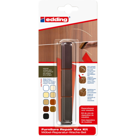 Bútorjavító viaszkészlet bútorokon vagy más függőleges vagy vízszintes fafelületeken keletkezett repedések és lyukak kitöltésére és javítására. A különféle viaszárnyalatok keverésével a fa textúrája tökéletesen utánozható. A puha viaszok ásványi viaszok keverékéből állnak, és földből, illetve oxidációból származó pigmentekkel vannak színezve. Elérhető 10 különböző kiszerelésben, csomagonként 3 különböző színnel és egy műanyag spatuláv
