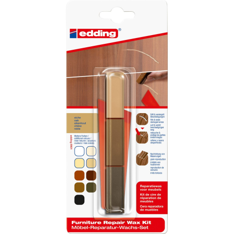 Bútorjavító viaszkészlet bútorokon vagy más függőleges vagy vízszintes fafelületeken keletkezett repedések és lyukak kitöltésére és javítására. A különféle viaszárnyalatok keverésével a fa textúrája tökéletesen utánozható. A puha viaszok ásványi viaszok keverékéből állnak, és földből, illetve oxidációból származó pigmentekkel vannak színezve. Elérhető 10 különböző kiszerelésben, csomagonként 3 különböző színnel és egy műanyag spatuláv