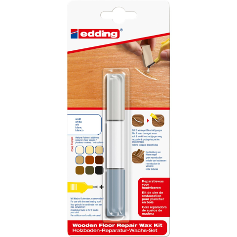 Padlójavító viaszkészlet sérült fapadló, például parketta, laminált padló és padlódeszkák, valamint más, nagy terhelésnek kitett vízszintes fafelületek javításához. A kemény viaszt a feltöltés előtt meg kell olvasztani a rendelkezésre álló edding 8903 viaszolvasztó páka segítségével. A különféle viaszárnyalatok keverésével a fa textúrája tökéletesen utánozható. A kemény viaszok ásványi viaszok keverékéből állnak, és földből, illetve oxidáci
