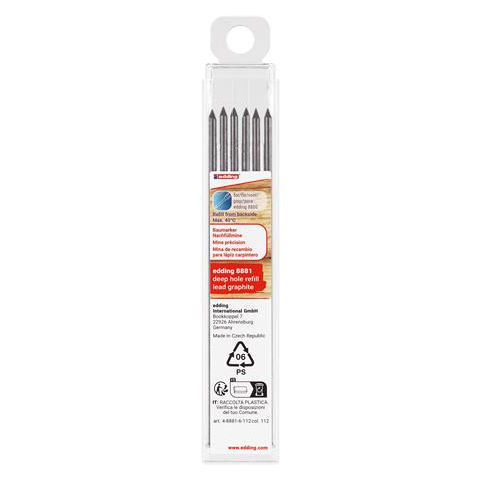 Grafitbél, furatjelölőhöz, 2,8 mm, EDDING 8881, grafit Edding 8880 mélyfurat jelölő ceruza utántöltő hegyek, 6 darabos grafitbél készlet. -sima felületről eltávolítható -vízálló (kivéve üvegen) -a hegyeket legfeljebb 40°C-on tárolja Gyártó/első EU fo