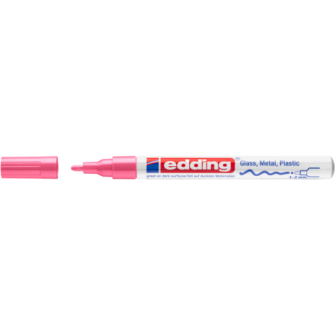 Üveg, porcelán, műanyag, fém illetve szinte minden felület feliratozására, jelölésére alkalmas, különösen ajánlott szennyezett felületekhez, lakk- és dekorációs fémtestű marker. Kerekített csúcs, fémtest, permanent, lakkszerűen fedő festékkel töltve. Gyorsan száradó festék, írásképe törlés- és vízálló, magas fény- hő- és törlésálló. Festékadagolása egyenletes, szelep vezérli, pótcsúcsolható (EDDDING 751 N írócsúcs). Vonalvastagság: 1-2 mm.